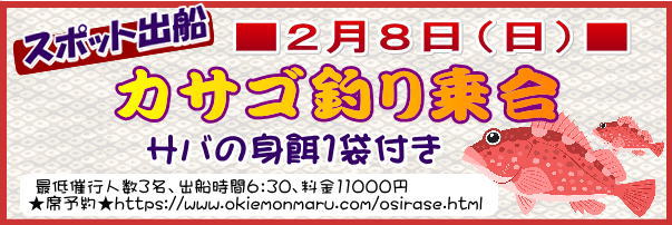 南側駐車場ゲート開門時間4:00です。 4時00分以降にご来店下さい お客様の御協力を宜しくお願いします ![]() ↑↑クリック ※ネット予約のキャンセルができるのは 2日前の午後1時(13時)迄です。 ※おにぎりの注文は電話でお願いします ※ネット予約は1週間前のPM7時から 前日のPM7:00迄です ※予約なしでも当日出船確定の船は乗船出来ます ※電話予約の方は着座予約となり着座の指定は出来ません。 こちらで調整して着座は確保します。 (※但し、並び席や船長の近く、トイレの近く等のご希望ありましたらご相談下さい。) ![]() ★乗合船の出船予定表★ ○出船、×休船、△問合せ 最新情報は、速報ブログご確認ください。